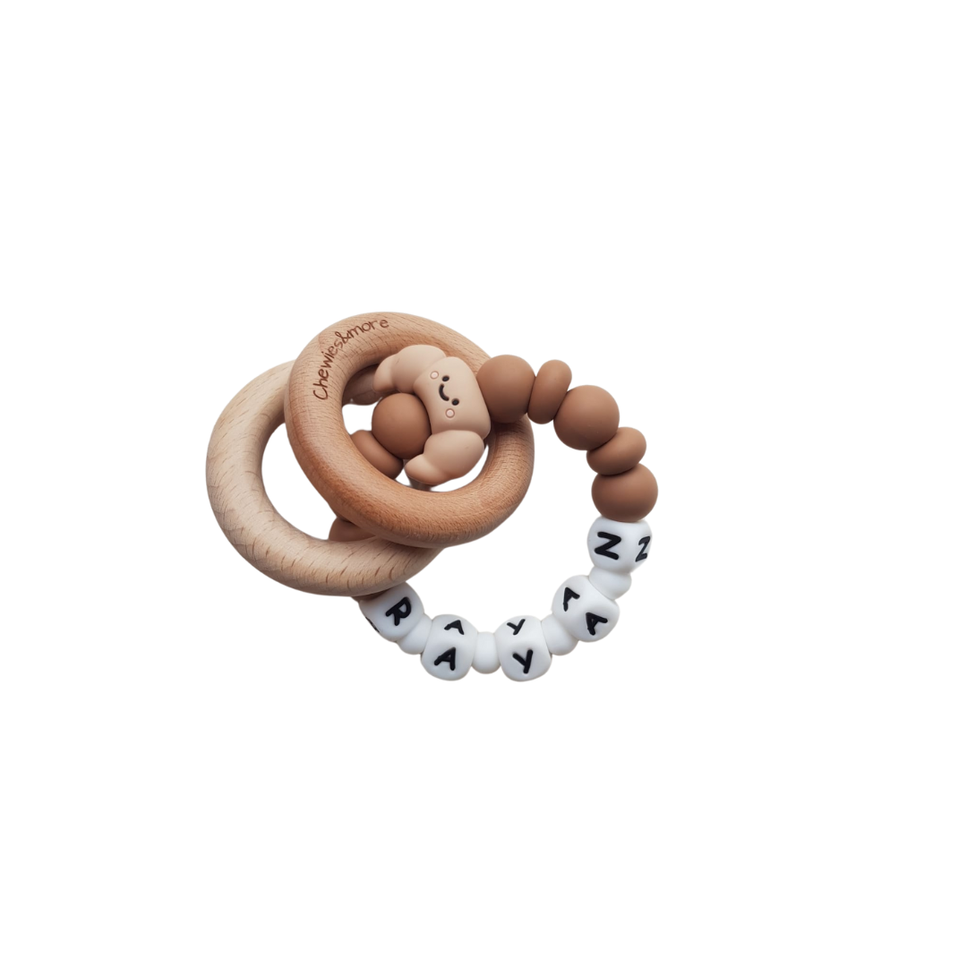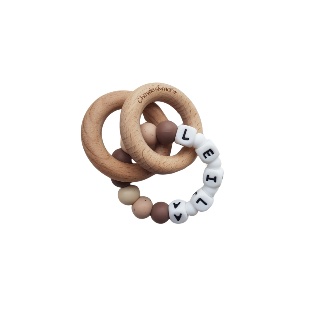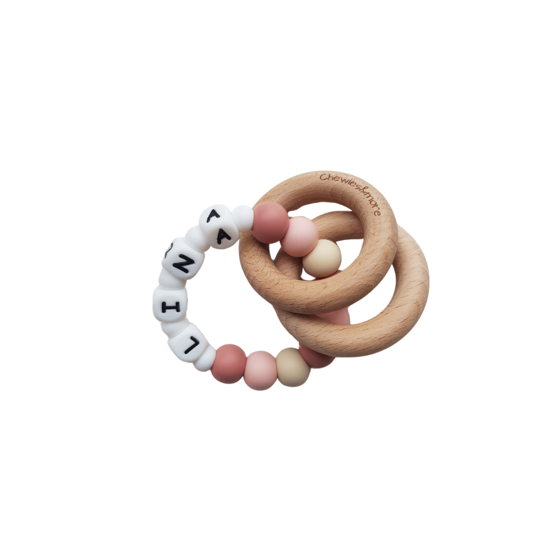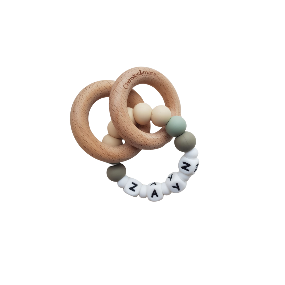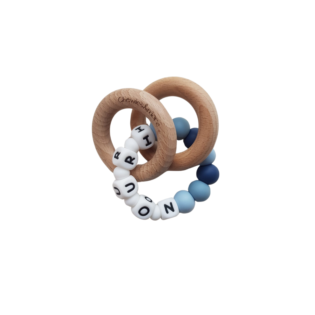 This Name Chewie is made of silicone beads combined with 2 wooden rings, these wooden rings are easy for your little one to hold and they make a soothing rattling sound. And how fun is it, your little one's name on his or her own Chewie!